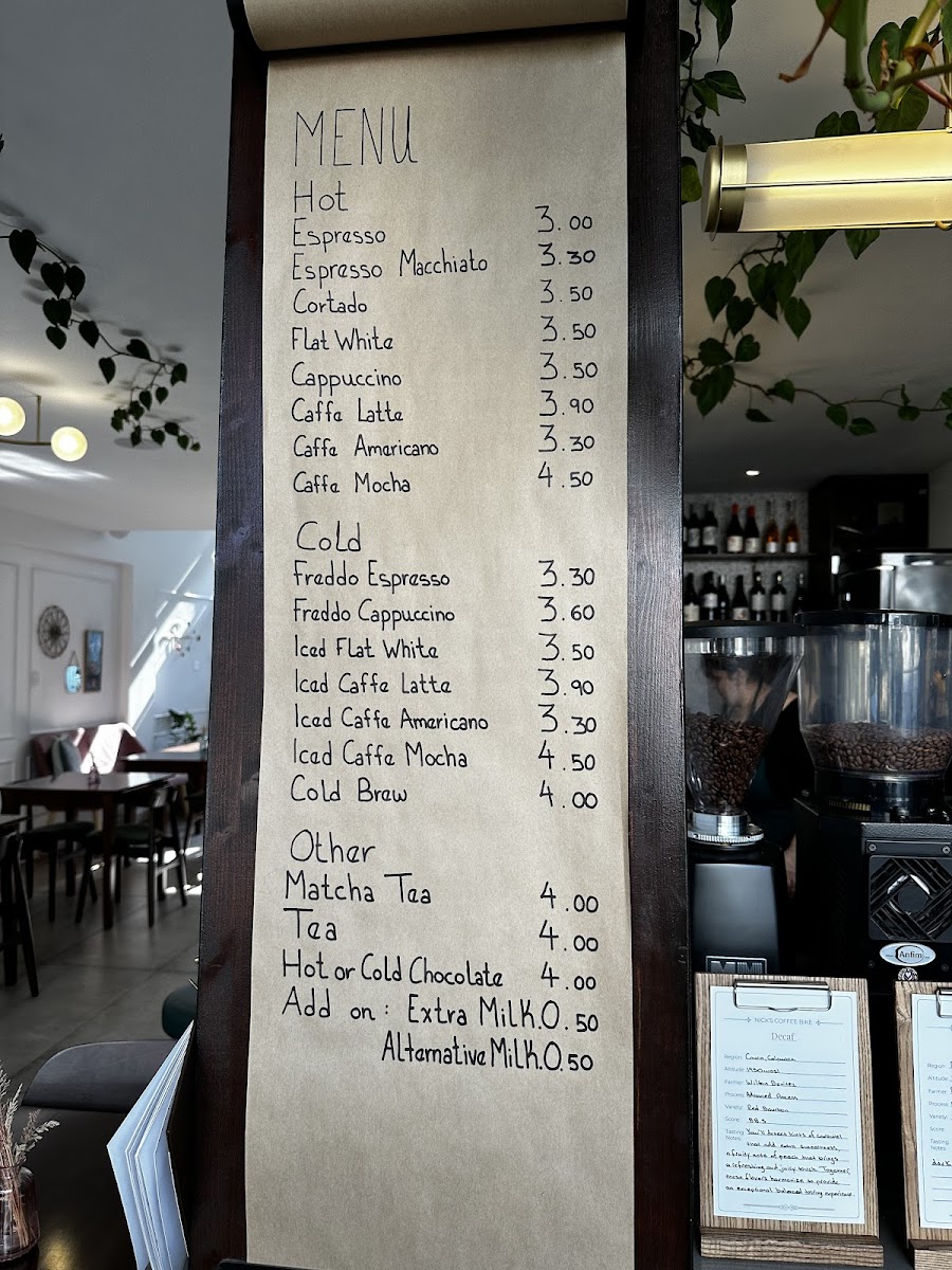 - Hot Coffees: The Mocha (€4.50) blends rich coffee with chocolate sweetness, while the Cappuccino (€3.50) strikes the perfect balance of coffee and milk.